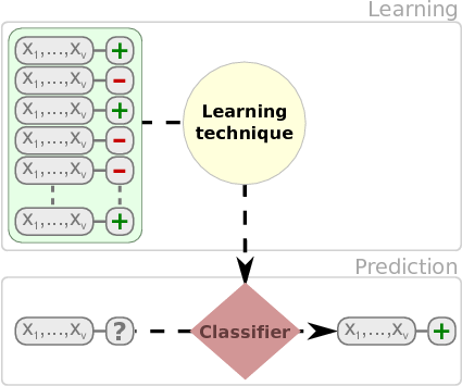 A classification problem can be defined as the induction, from a dataset \(\cal D\), of a classification function \(\psi\) that, given the attribute vector of an instance/example, returns a class \({c}\). A regression problem, on the other hand, returns an numeric value.